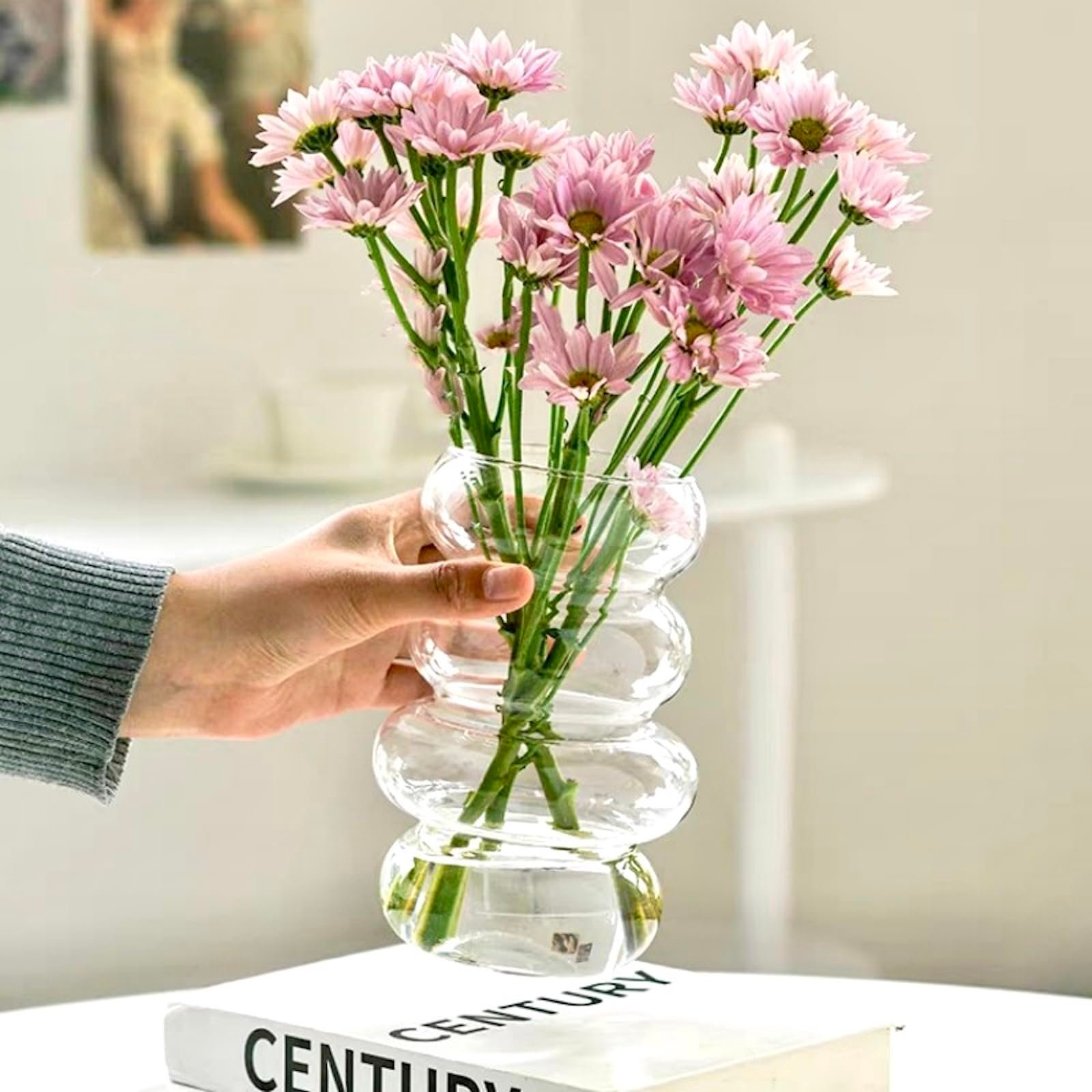Artistic etched design on clear glass vase.