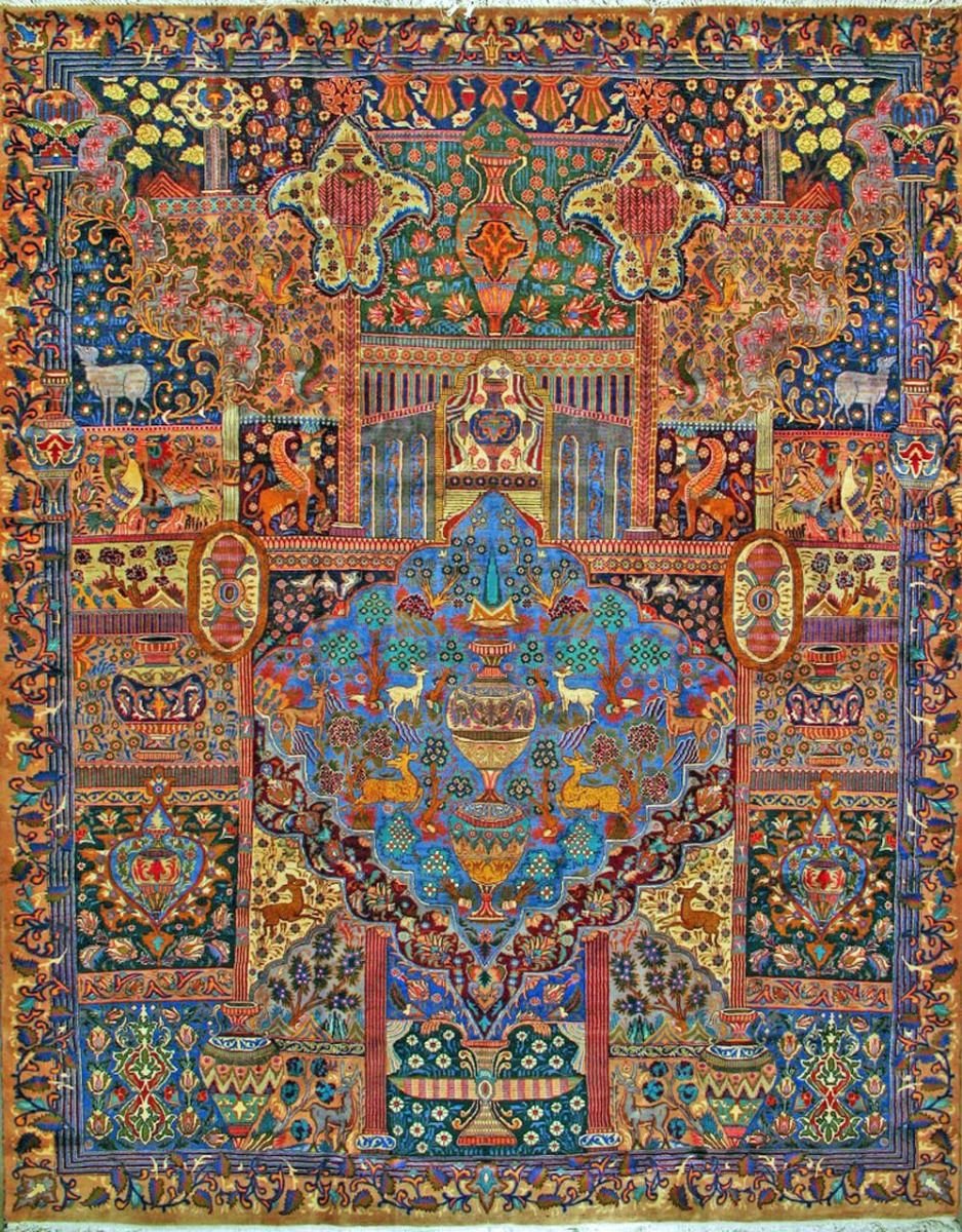 Handcrafted vintage-style carpet with royal blue and gold patterns, great for entryways, bringing historical elegance to small spaces.